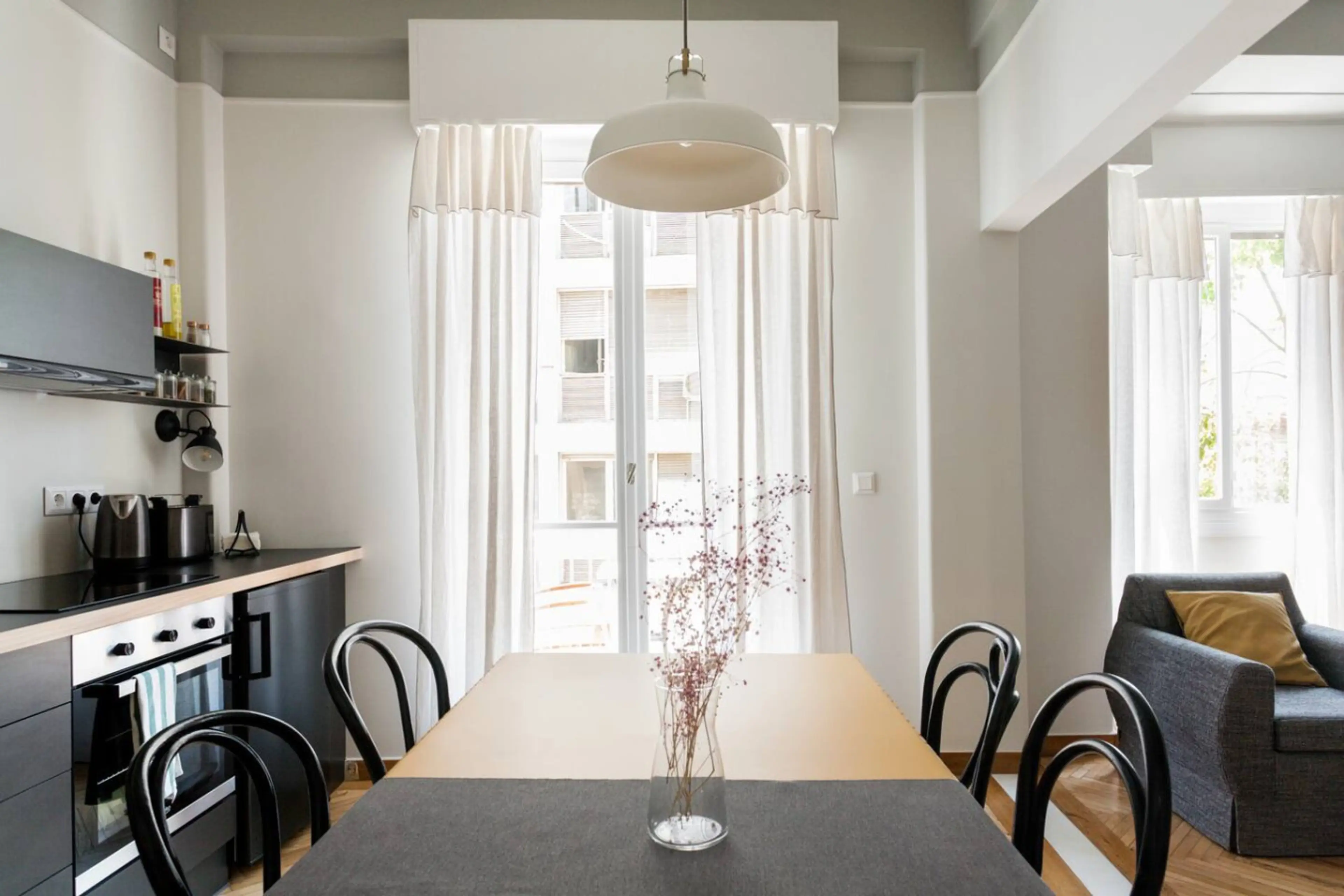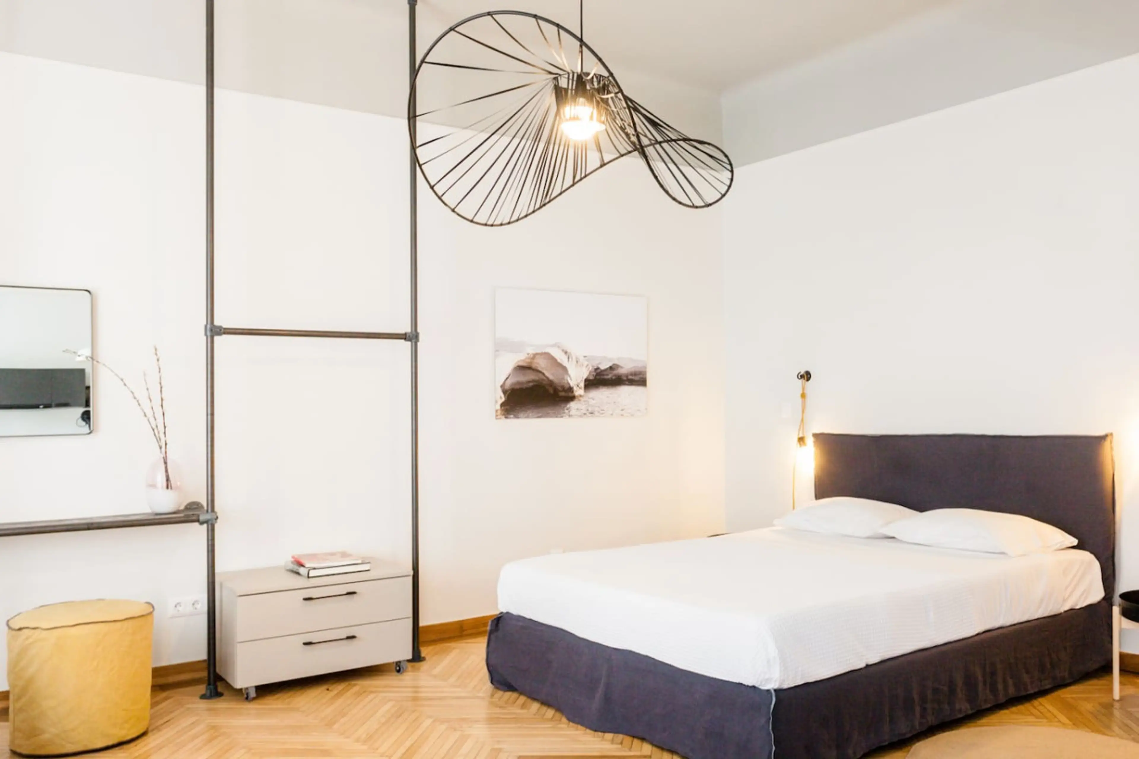 Awaken as morning light fills a bright and contemporary open space. Cross a parquet floor and unlatch French doors to let fresh air fill the room along with the Greek sun. Make breakfast in a sleek matte-black kitchen in a renovated 1930s building. The studio is located on the third floor in a well...